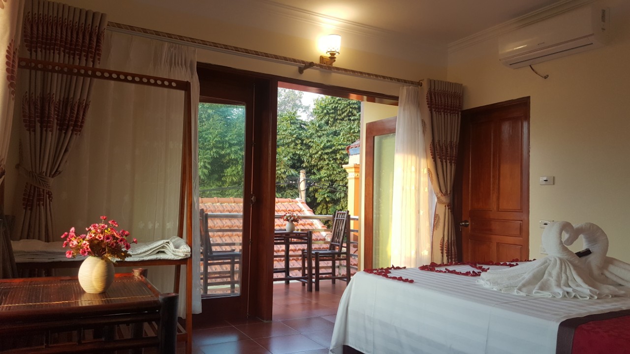 Phòng Deluxe 1 giường đôi và 1 giường đơn. Phòng rộng rãi và thoáng đãng, có cửa sổ nhìn ra sông núi cho bạn đón nắng mai buổi sáng giúp tinh thần sảng khoái mỗi ngày.Trong phòng có đầy đủ wifi, nóng lạnh, điều hòa, khăn tắm, máy sấy tóc, giá để vali khung treo quần áo. Phòng có cửa sổ thông thoáng, đón nắng và gió.